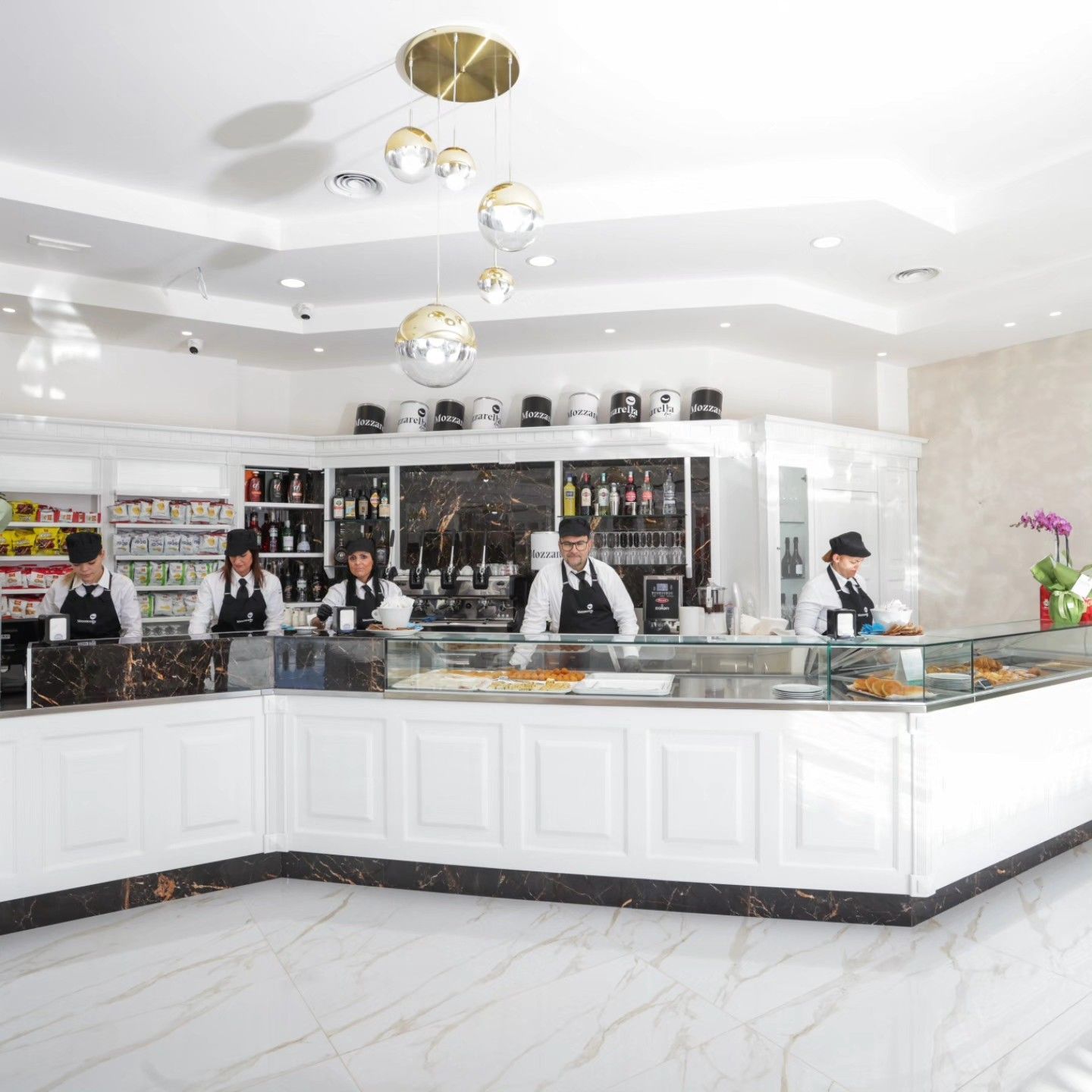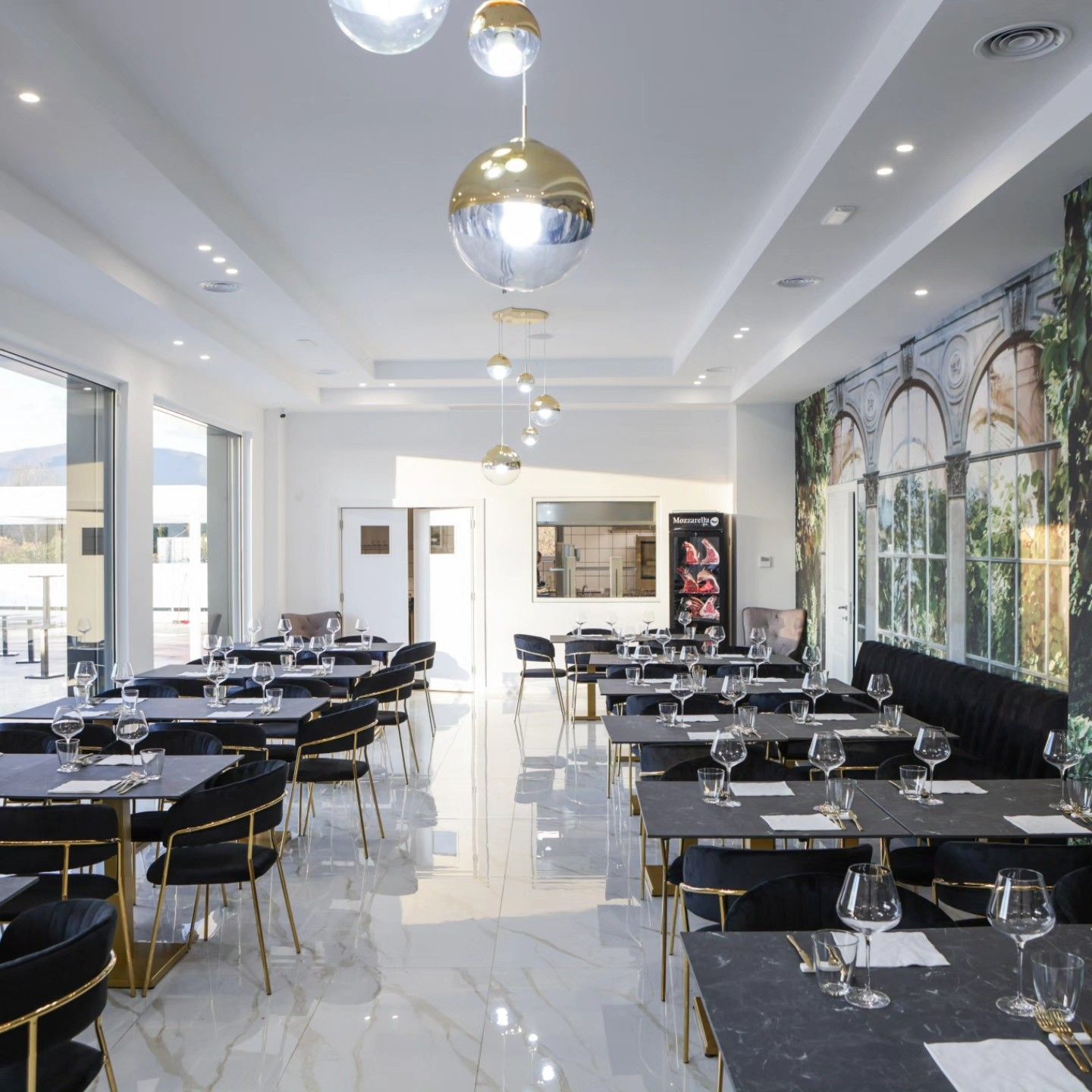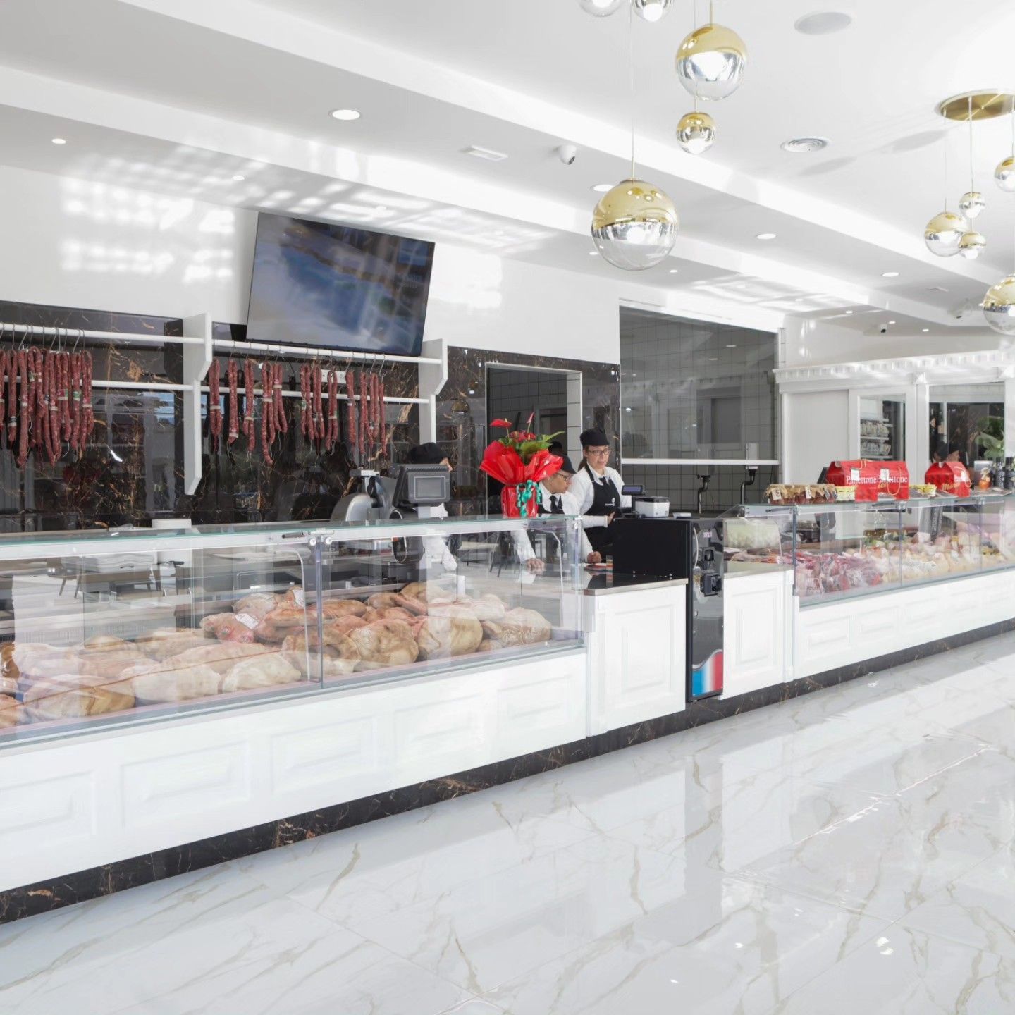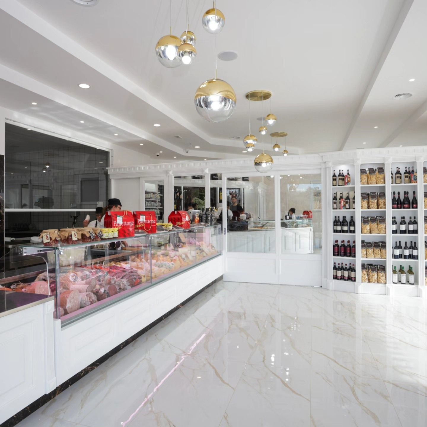 La fornitura comprende arredi su misura, cucine, celle frigo e vetrine espositive.